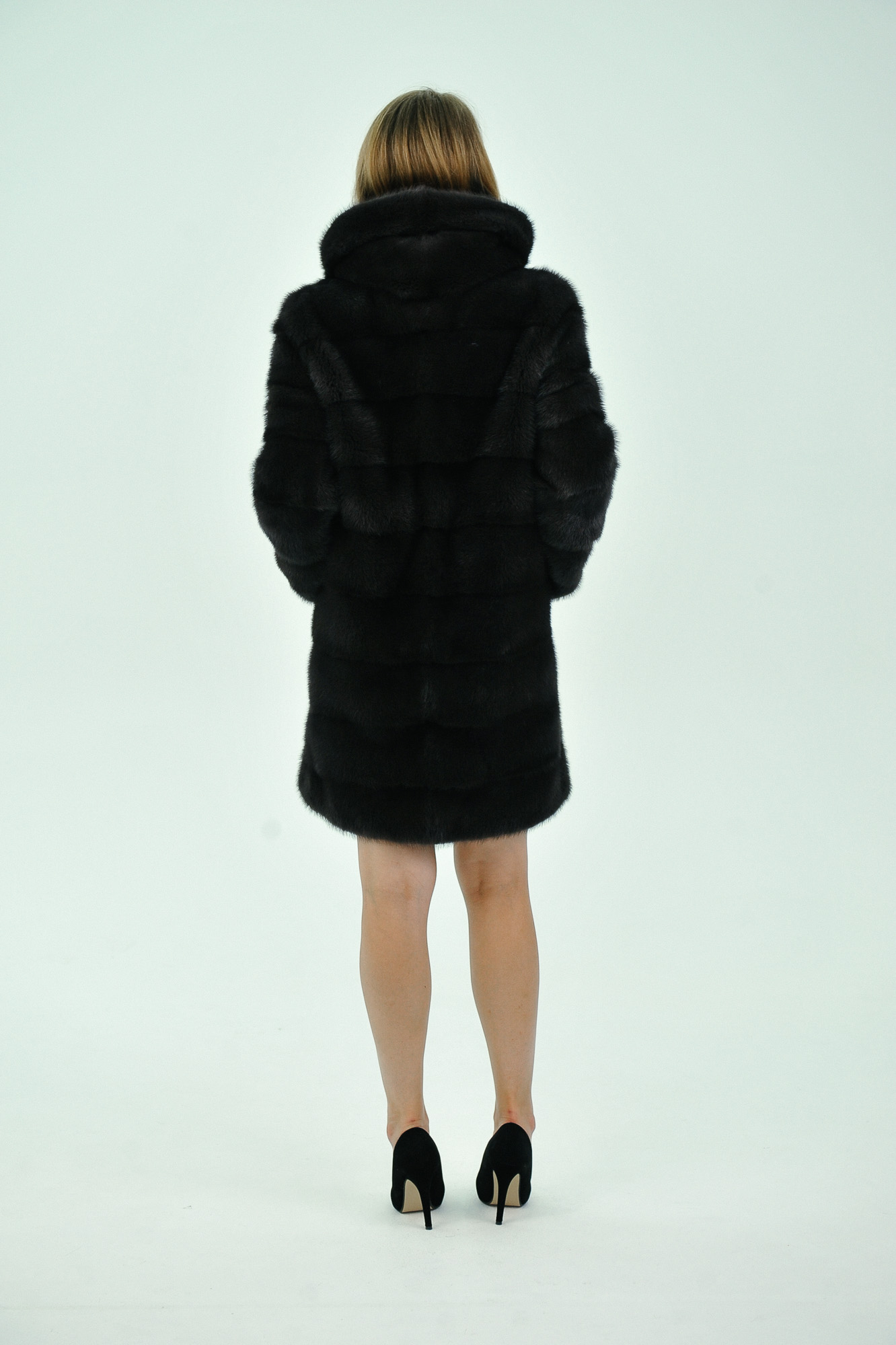Шуба из меха норки темного графита.Классическая укороченная модель с теплым капюшоном, застежкой на крючки и прорезными карманами.