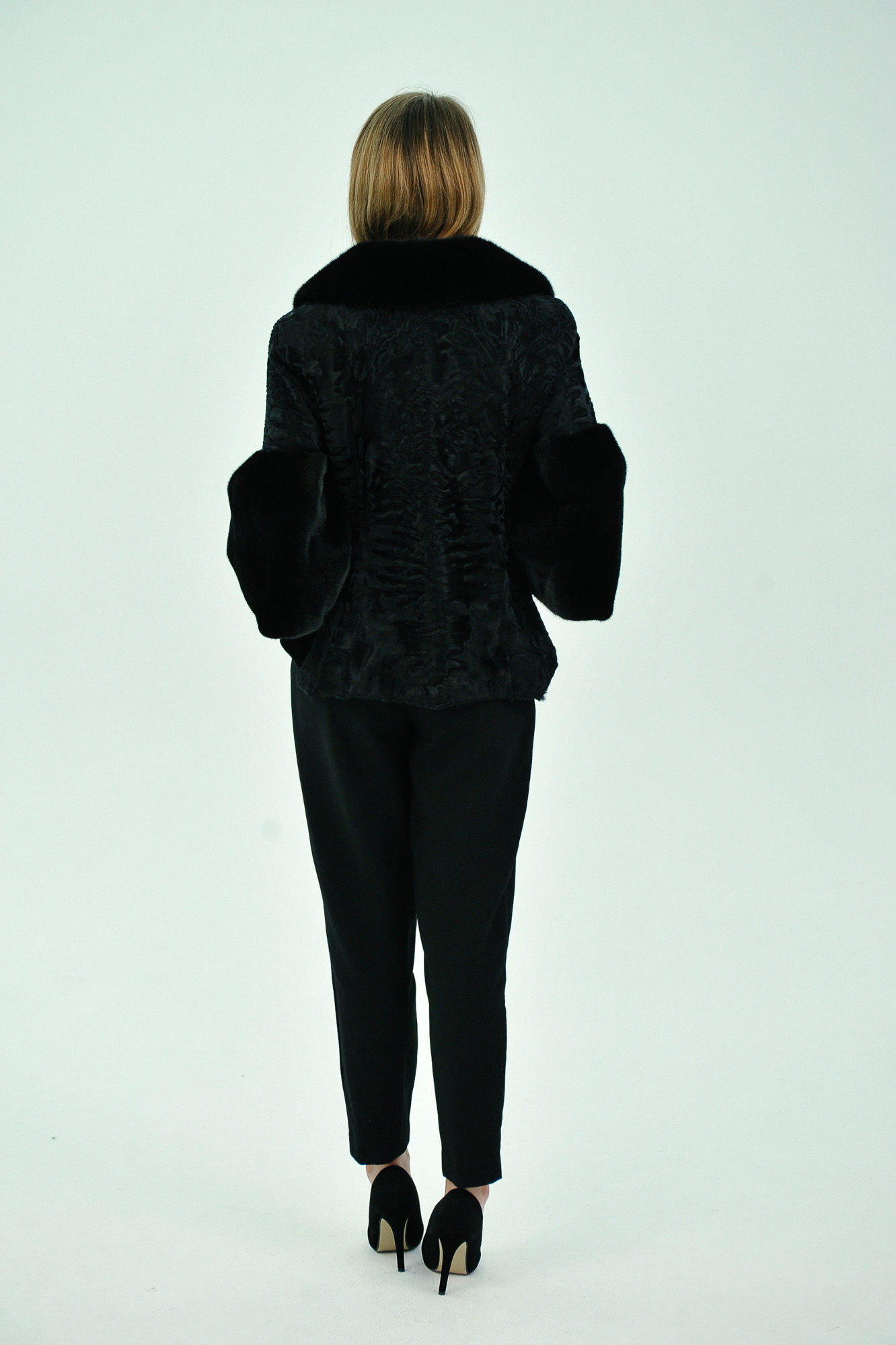 Укороченная шуба из меха норки с отделкой из каракуля, черного оттенка. Модель прямого силуэта с горизонтальной раскладкой меха, теплым воротником-стойкой и застежкой на крючки и крупную пуговицу.
