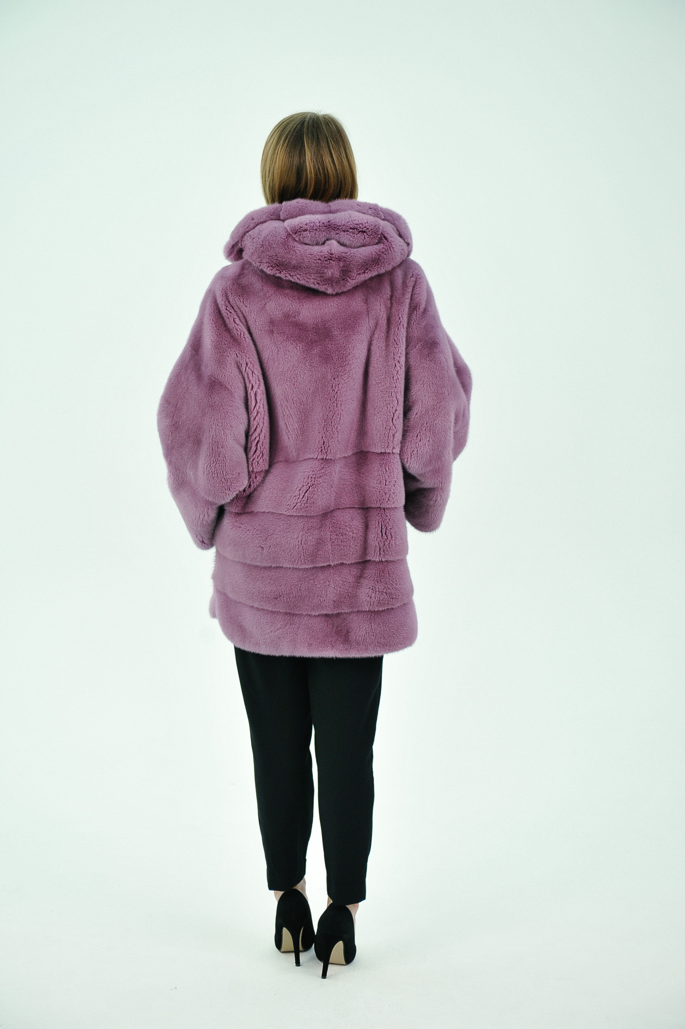 Норковая шуба из меха норки пурпурного оттенка. Женственная модель прямого силуэта с застежкой на крючки и крупную пуговицу, прорезными карманами, дополненная теплым капюшоном и кулиской по низу.