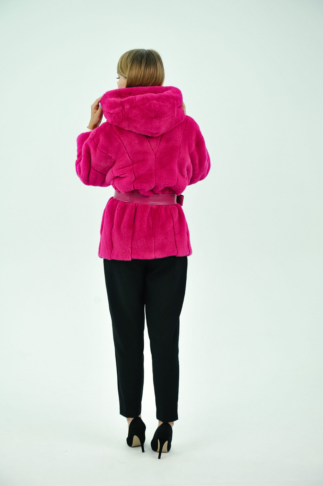 Короткая классическая шуба из меха норки ярко-малинового оттенка. Удобная модель прямого силуэта с теплым капюшоном, прорезными карманами и мягким поясом из экокожи